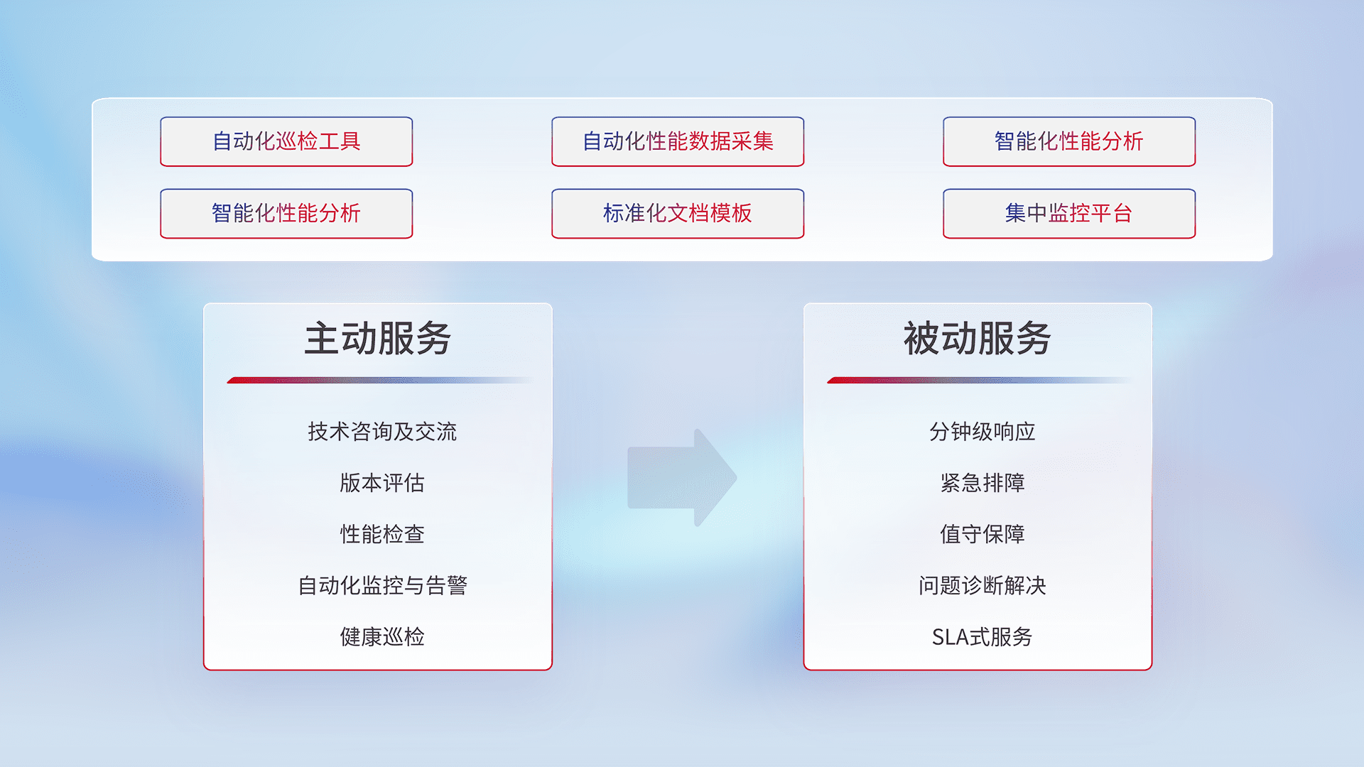 智能化工具和标准化文档,,,保障服务质量,,,提供主动服务(包含技术咨询、、、版本评估、、、、性能检查、、、自动化监控与告警、、、健康巡检)和被动服务包含(分钟级响应、、紧急排障、、值守保障、、、问题诊断解决、、、、SLA服务)。。。